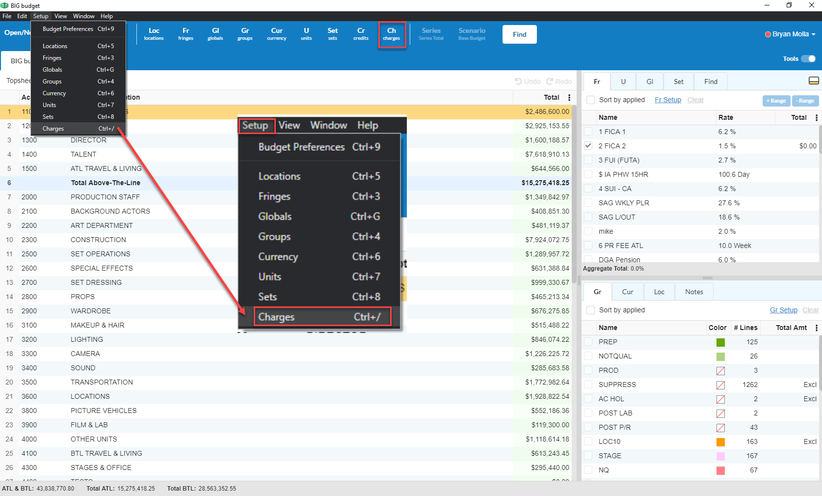 - In the menu bar, go to Setup and select Charges or select the Charges icon from the toolbar at the top. This opens the Budget Setup window with Charges tab selected.